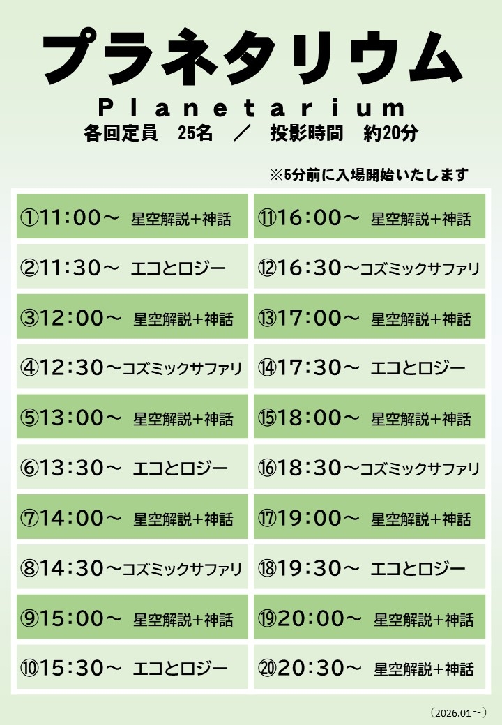 投影時間は一回約20分、定員は25名です。 定員になった場合、別の回の整理券をご購入ください。
