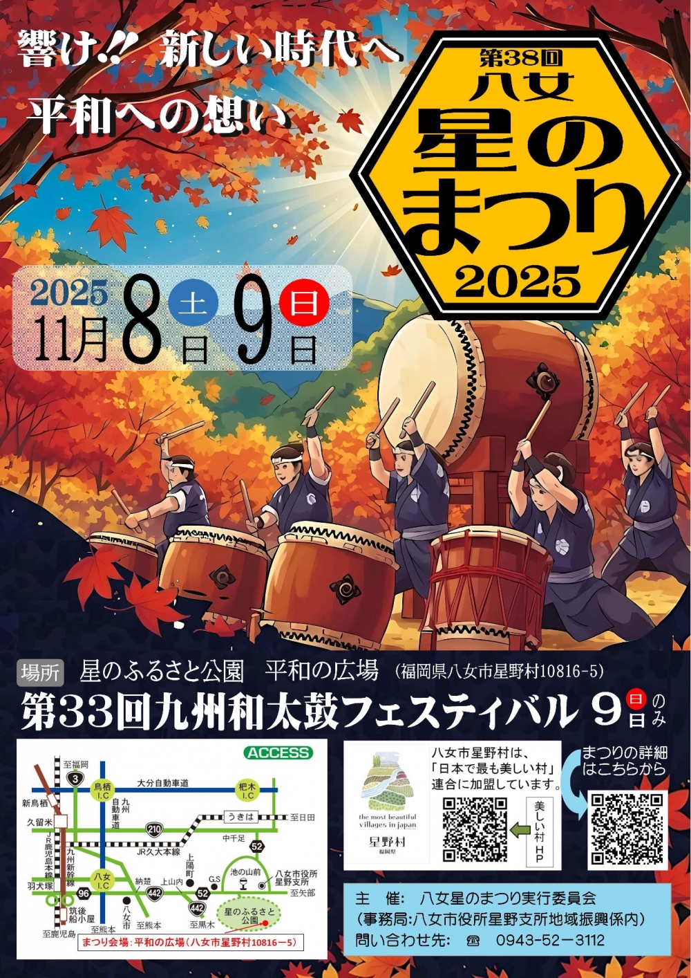 9日は第33回九州和太鼓フェスティバルです。迫力満点の太鼓が星野村の大自然に響き渡りますよ!