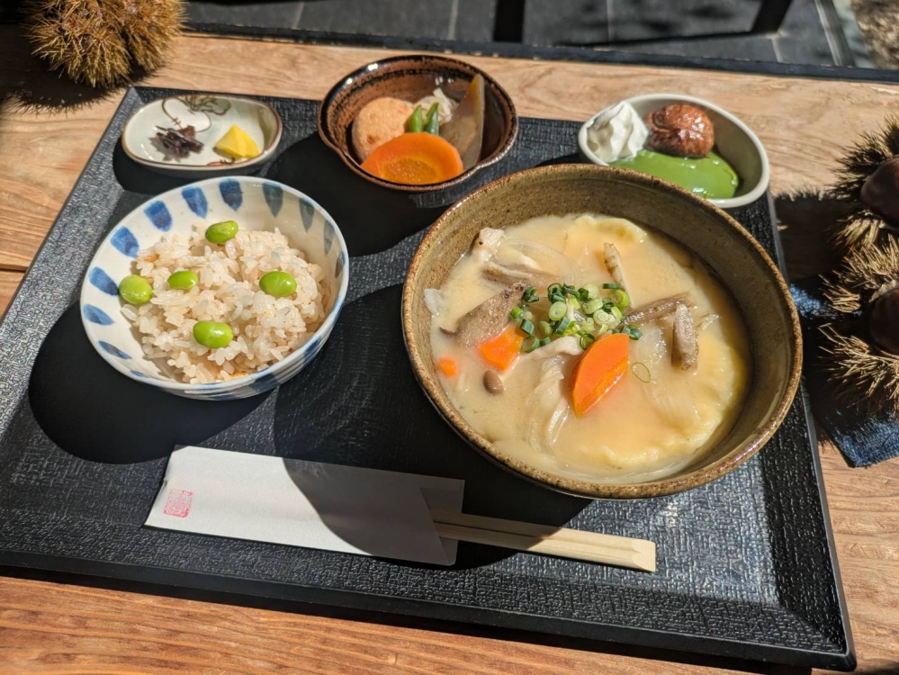 茶寮(お食事処)では、この期間限定でだご汁御膳を1,400円で提供しております。